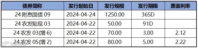 利率债发行方面,上周发行投标热度较上上周有所上升,热门券种20年期23国开清发20(增发18),全场倍数9.47,边际倍数4.77;7年期24进出07(增7),全场倍数8.74,边际倍数3.89。上周利率债发行价格和机构投标情绪如下表所示:
