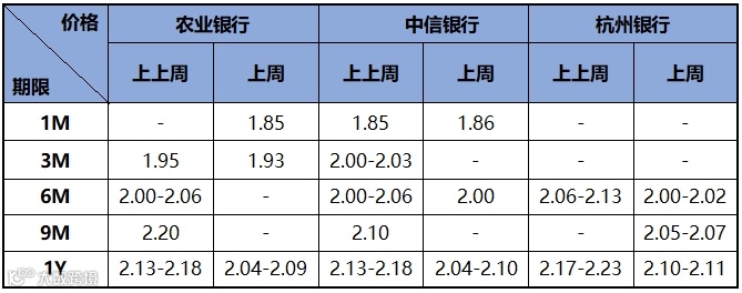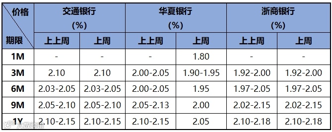 存款价格方面,上周交行、浙商未有存款报价,华夏银行各期限存款价格下行均超过10bp。近两周存款市场情况如下表所示: