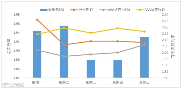 期限利差方面,上周发行数量较多的1年期和3个月存单的发行利差为9bp,较上上周利差大幅下降8bp。主体利差方面,上周股份制和国有行同业存单利差为5bp,较上上周变化不大。