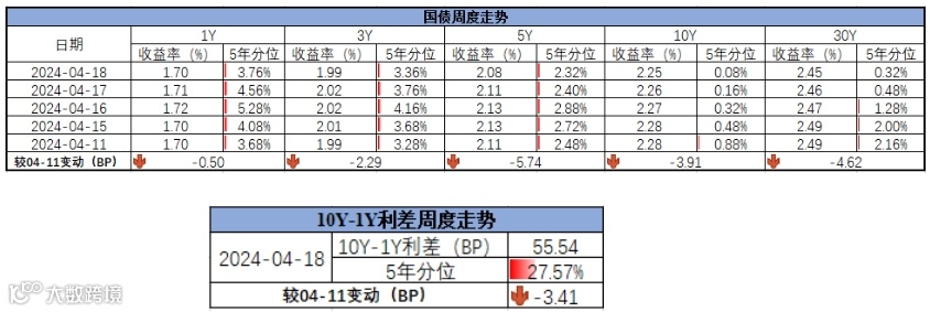 截至4月18日,国债收益率短端长端皆下行,曲线走平,10Y-1Y利差为55.54,较4月11日下降3.41BP,处于近5年27.57%的历史分位。