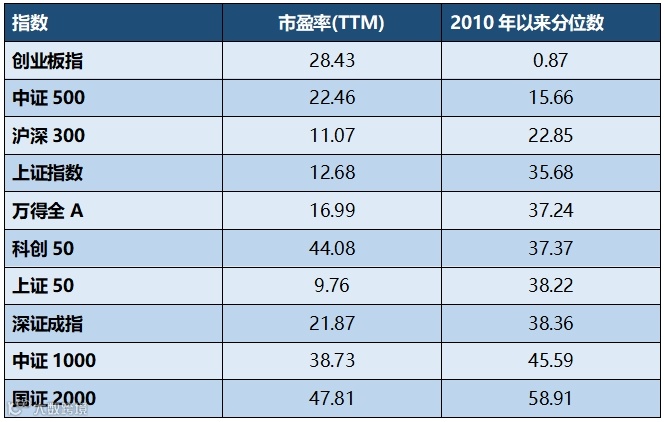 备注:科创50、中证1000、国证2000市盈率(TTM)为指数发布以来的分位数