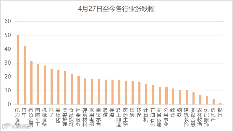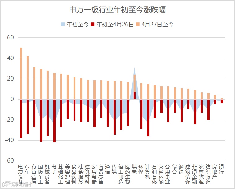 其中,分段来看:年初至4月27日市场见底之前,表现靠前的是煤炭、银行、房地产、建筑装饰、农林牧渔等,主要是低估值稳增长品种,以及通胀主题相关品种;表现靠后的是TMT、国防军工、电力设备、机械设备等,偏成长类行业。4月27日至今,市场出现较大幅度的反弹,表现较好的行业主要是偏成长的电力设备、汽车、有色金属、国防军工、机械设备、电子等,主要与新能源主题、政策刺激相关。前期涨幅较好的银行、房地产、建筑装饰等反而在反弹中表现落后。