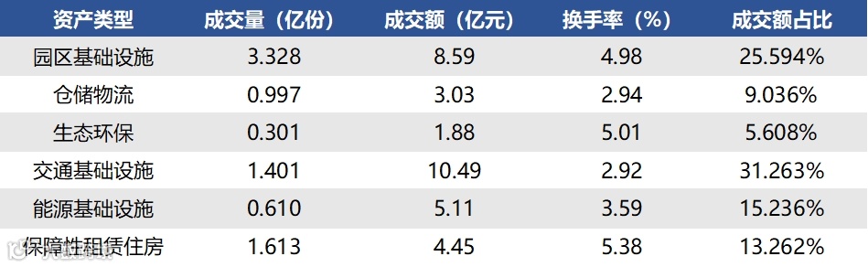 2024年3月4日至2024年3月8日,合计成交量8.249亿份,成交额33.568亿元,区间换手率4.0893%。各资产类型方面,上周基础设施REITs成交量最高,共计3.328亿份;生态环保REITs成交量最低,共计0.301亿份。另外在成交额占REITs总成交额比重中,交通基础设施REITs(31.263%)排名较高,生态环保REITs(5.608%)排名较低。