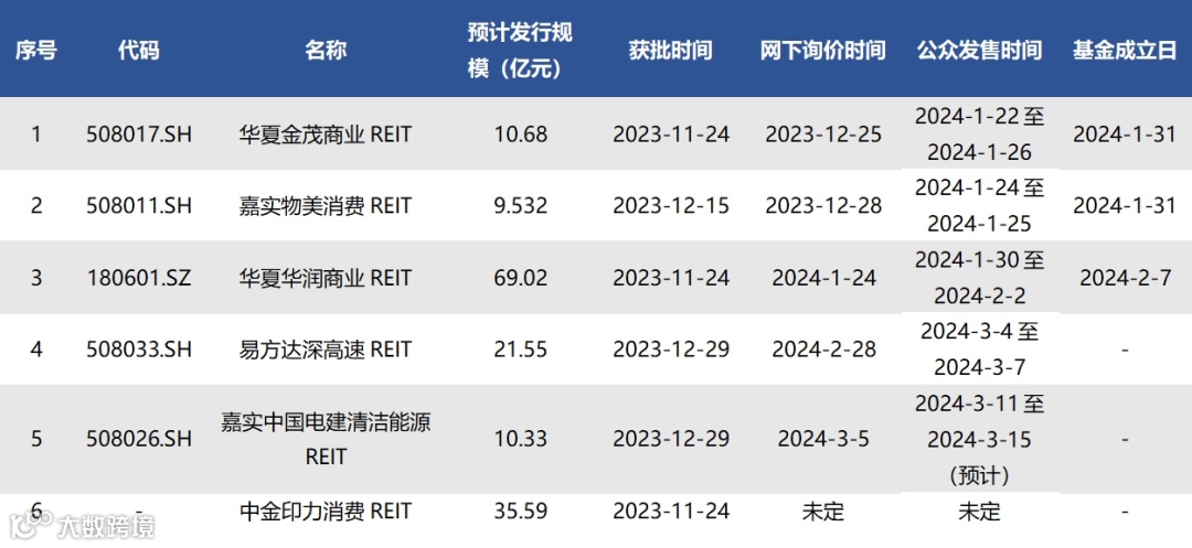 截至3月8日,已获批待上市REITs共有6只,情况如下表所示: