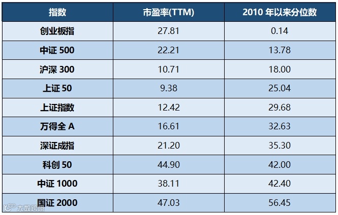 备注:科创50、中证1000、国证2000市盈率(TTM)为指数发布以来的分位数