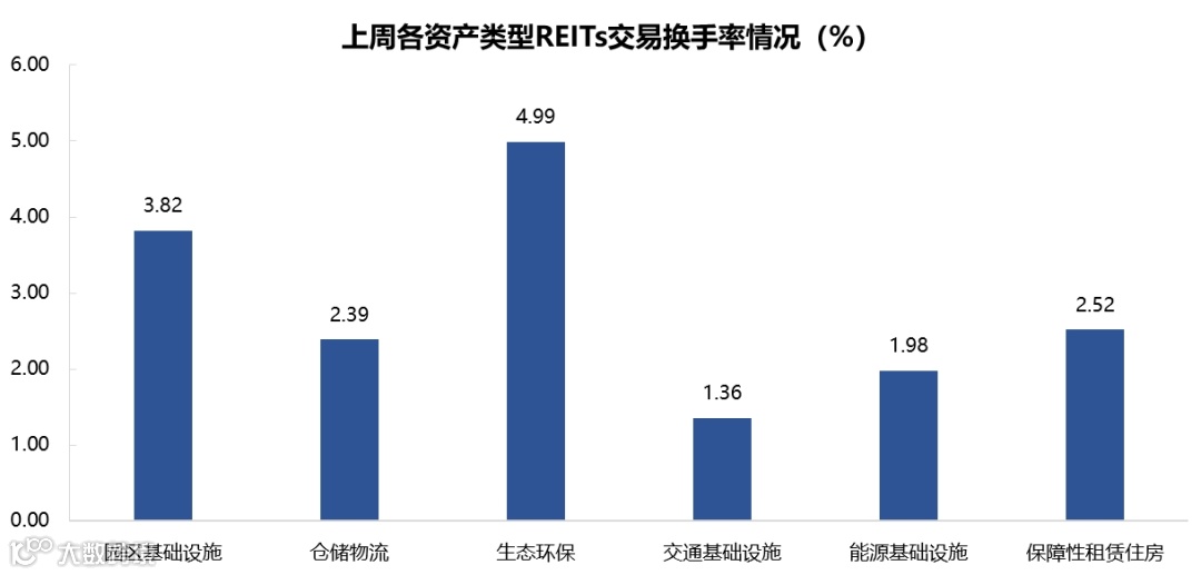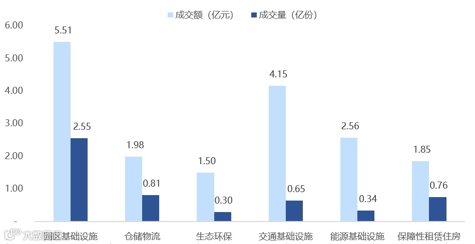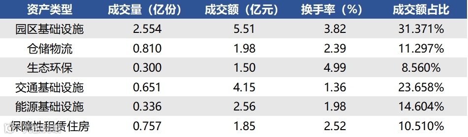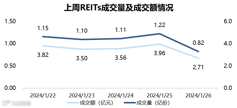 2024年1月22日至2024年1月26日,合计成交量5.408亿份,成交额17.558亿元,区间换手率2.6807%。各资产类型方面,上周园区基础设施REITs成交量最高,共计2.554亿份;生态环保REITs成交量最低,共计0.300亿份。另外在成交额占REITs总成交额比重中,园区基础设施REITs(31.371%)排名较高,生态环保REITs(8.560%)排名较低。