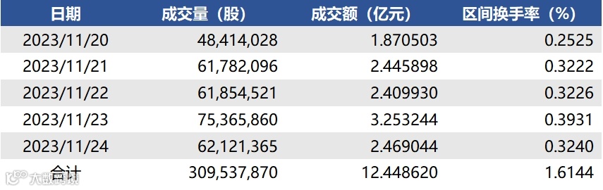 2023年11月220日至2023年11月24日,合计成交量3.095亿股,成交额12.449亿元,区间换手率1.6144%。各资产类型方面,上周园区基础设施REIT成交量最高,共计1.244亿股;生态环保基础设施REIT成交量最低,共计0.113股。另外在成交额占REITs总成交额比重中,交通基础设施REIT(35.057%)排名较高,生态环保REIT(5.714%)排名较低。