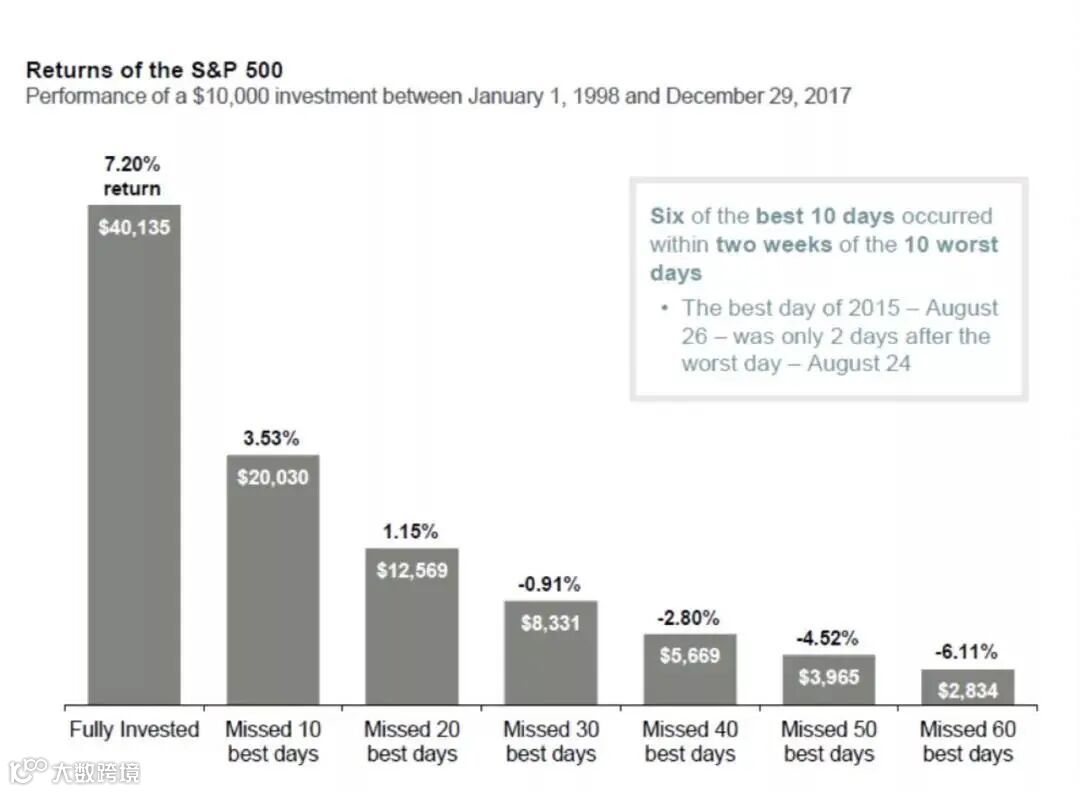从1998年1月1日到2017年的12月29日,如果一个投资者满仓标普500,包括每次获得的分红都投入,那么1万美元的本金会变成40135美元,年化回报率为7.2%。如果你因为各种原因错过了这几年市场表现最好的10天,那么这个惩罚是巨大的,年化回报率会一下子跌到3.53%。1万美元本金变成20030美元。如果你错过了这个阶段表现最好的20天,那么年化回报率会变成低得可怜的1.15%,1万美元本金最终变成12569美元。