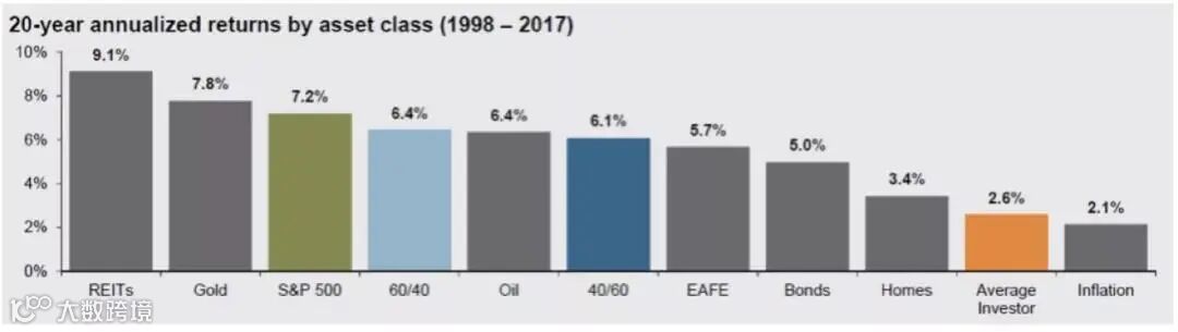 我们以这个思维方式来看个人投资者收益率,下面是在最牛的美股市场中1998到2017年的20年各类资产年化收益率。我们看到标普500在这个20年中取得了7.2%的年化收益率,而散户的平均年化收益率是2.6%,仅仅跑赢了2.1%的通胀率,跑输所有资产。