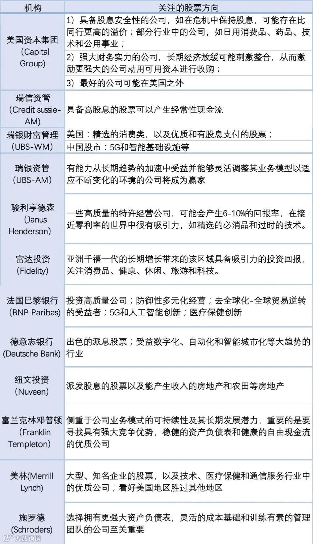 相比低收益债券,权益资产更具吸引力,但同时富达投资、安联等机构也提到了因疫情带来了国家间、部门间、公司间的输家和赢家。