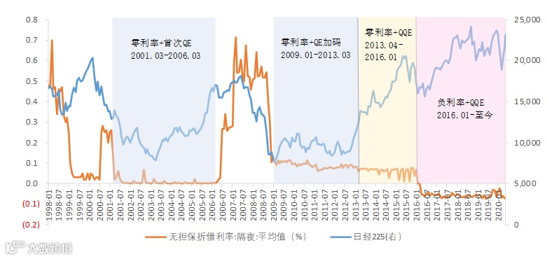 1995年,日本刚刚进入超低利率的时候,日经225指数曾经出现短暂上涨;2001年流动性宽松曾在短期内提振了股市;2008年金融危机之后,日本央行扩大量化宽松进一步升级为负利率下的QQE,日经225指数在底部横盘三年多左右开始上行。