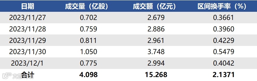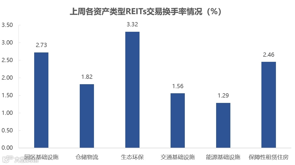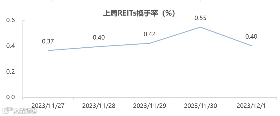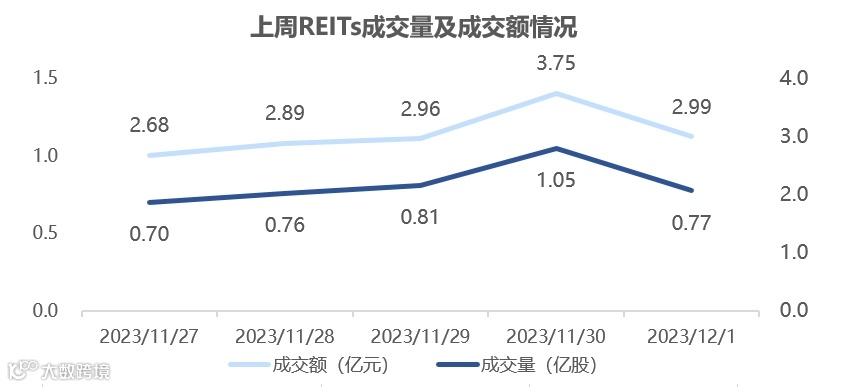 2023年11月27日至2023年12月1日,合计成交量4.098亿股,成交额15.268亿元,区间换手率2.1371%。各资产类型方面,上周园区基础设施REITs成交量最高,共计1.821亿股;生态环保基础设施REITs成交量最低,共计0.199亿股。另外在成交额占REITs总成交额比重中,交通基础设施REITs(33.564%)排名较高,生态环保REITs(6.832%)排名较低。