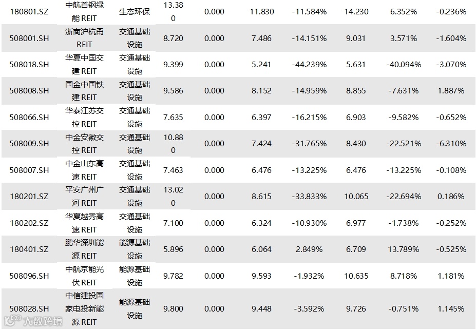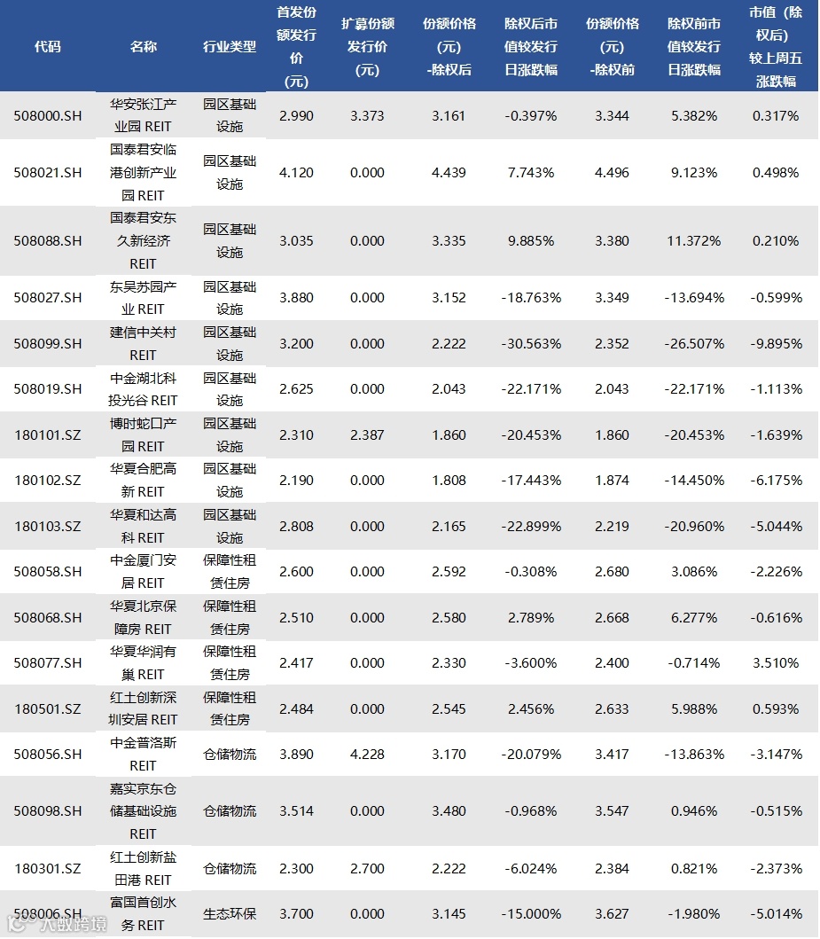 自上市交易以来,鹏华深圳能源REIT涨幅最大,总权益(除权前)较总发行市值涨幅达13.789%;华夏中国交建REIT涨幅最小,总权益(除权前)相较于总发行市值涨幅达-40.094%。
