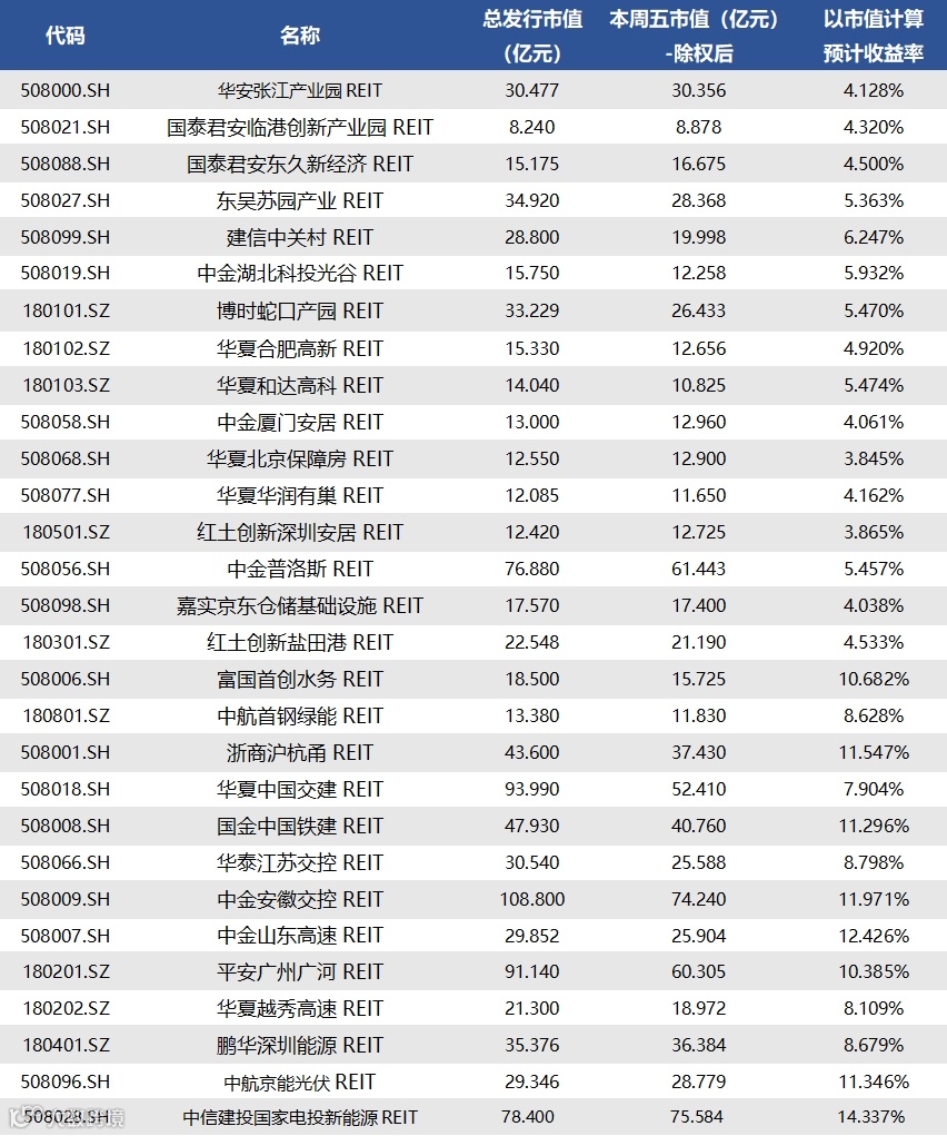 截至12月1日,已发行上市基础设施REITs 29只,已获批未发行基础设施REITs 4只,已反馈基础设施REITs 9只,已受理基础设施REITs 2只。截至12月1日收盘,上周REITs市场呈整体下降态势,已上市29只REITs总市值(除权后)总计820.626亿元,全市场公募REITs总权益(除权前)共计888.079亿元,总权益(除权前)相较于已上市REITs总发行市值涨幅为-11.649%。