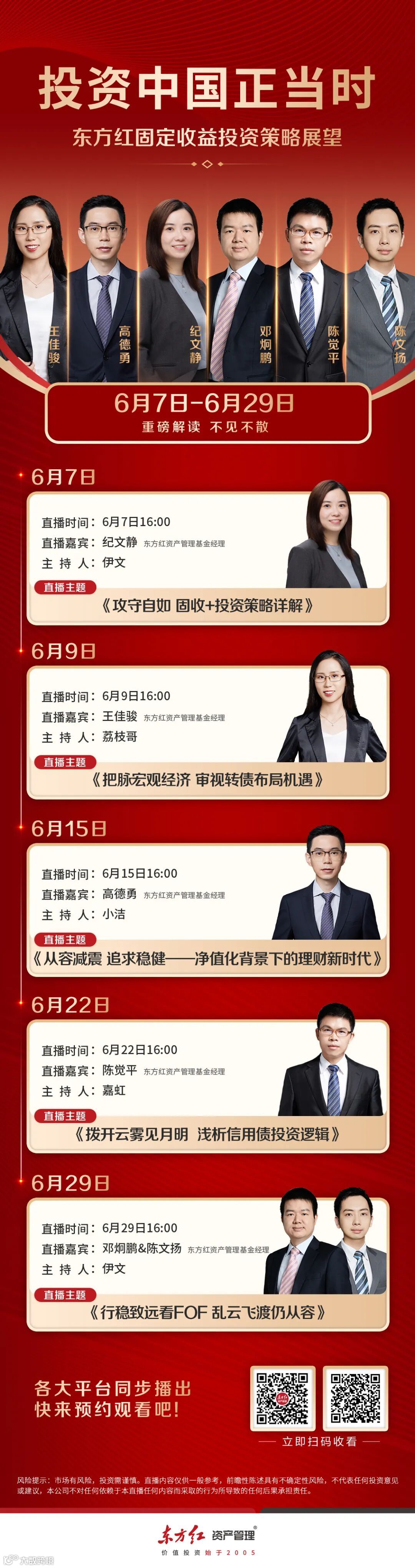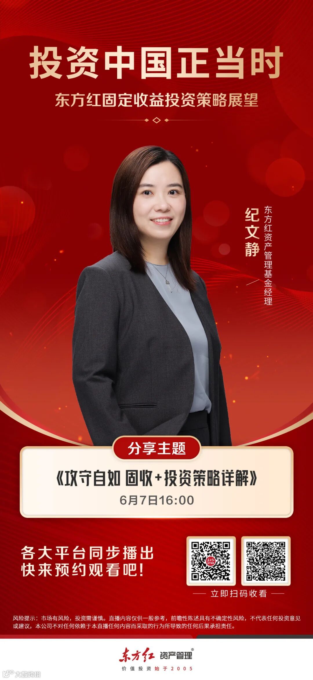 第一期直播将于6月7日下午16:00开始,由东方红固定收益投资部基金经理纪文静女士为投资者带来主题为《攻守自如 固收+投资策略详解》的最新解读和行业分析。欢迎一键预约!
