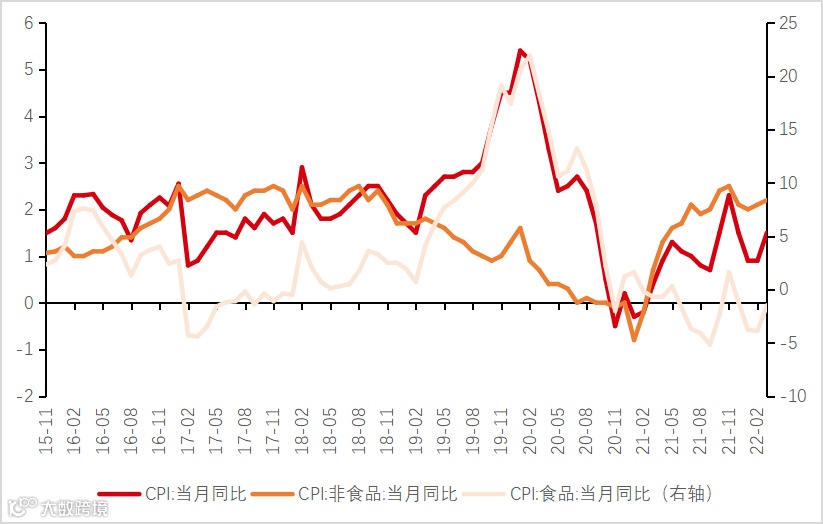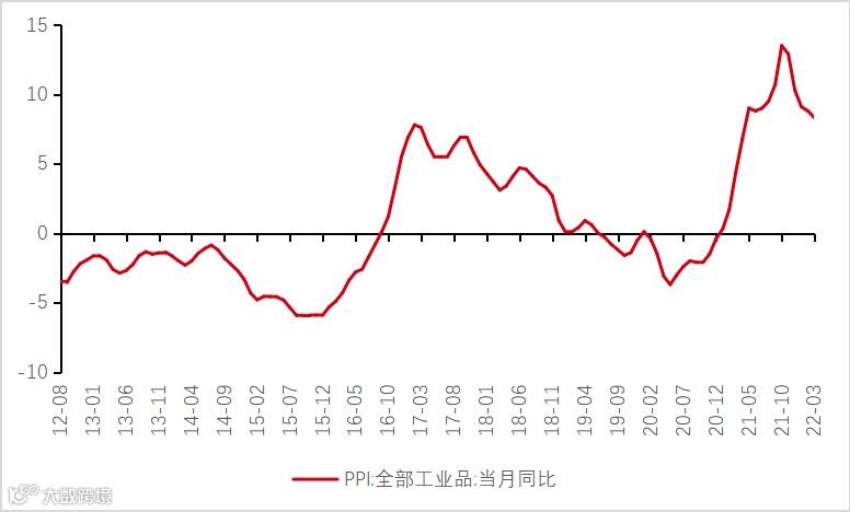 CPI方面,2022Q2可能仍然不会看到猪肉价格拐点来临。一方面,商品猪价格在2021年10月中旬反弹后,二元母猪和仔猪价格就停止下跌,表现坚挺,表明养殖端可能还在补栏后备母猪或者外购仔猪进行育肥。考虑到补栏的后备母猪要经过3-4个月的育肥才能配种,成为能繁母猪,因此能繁母猪存栏量数据有反转的风险。另一方面,3月以来国内疫情反复,对食堂、餐饮等需求影响较大,二季度本身也是猪肉消费的淡季。即使疫情形势改善后,终端需求有所恢复,但考虑到规模猪企在2022年的出栏量增长目标仍然较高,可能会出现竞争出栏从而压价的情况。核心CPI同比与领先8M的PPI同比有较好的拟合关系,因此核心CPI上涨将对冲猪肉价格的可能下跌对CPI的拖累。预计2022Q2的CPI同比中枢在2.5%附近。