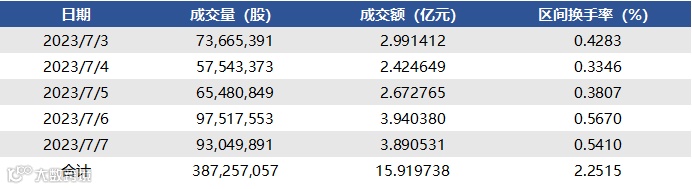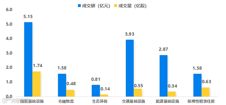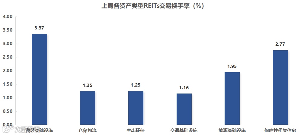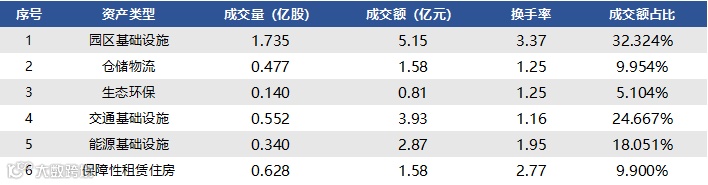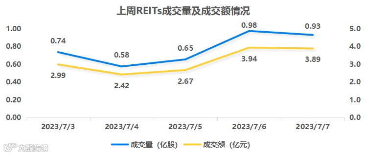 2023年7月3日至2023年7月7日,合计成交量3.873亿股,成交额15.920亿元,区间换手率2.25%。各资产类型方面,下周园区基础设施REIT成交量最高,共计1.735亿股;生态环保基础设施REIT成交量最低,共计0.140亿股。另外在成交额占REITs总成交额比重中,园区基础设施REIT(32.324%)排名较高,生态环保基础设施REIT(5.104%)排名较低。