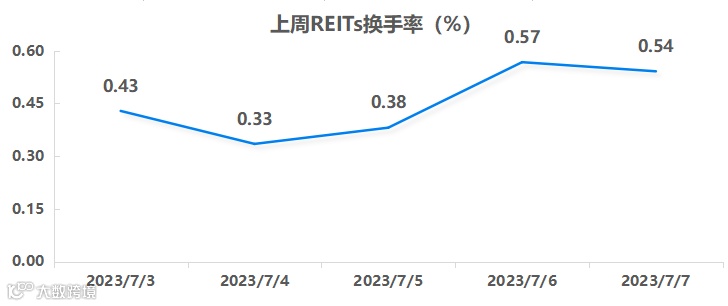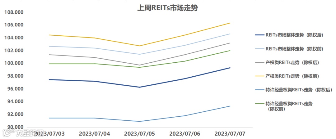 2023年7月3日至2023年7月7日,REITs市场走势呈现先跌后涨态势,整体小幅上涨,走势情况如下图所示: