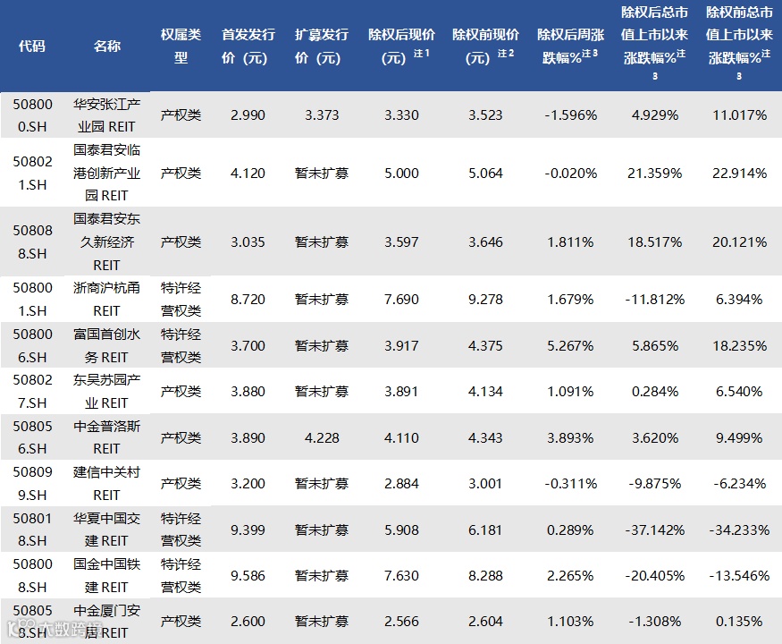注2:除权前现价,指在基金份额现价的基础上加回其自发行以来对应分红金额后的价格。由于公募REITs高分红的特征以及特许经营权类REITs“付息兼还本”的本质,除权前现价可更好的体现REITs产品的二级市场交易情况。