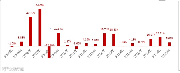 从年度数据看,从2004年—2021年期间,偏债混合型基金指数仅有2004年、2008年和2011年出现了下跌,分别为-1.08%、-17.16%和-3.62%,其余年份均实现正回报。