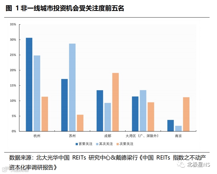 从城市维度来看,北京、上海各类资产受投资人关注的比例最高,体现了市场对北、上两座城市的投资偏好;在非一线城市中,关注度最高的前5名城市或区域分别为杭州、苏州、成都、大湾区(广、深除外)及南京。