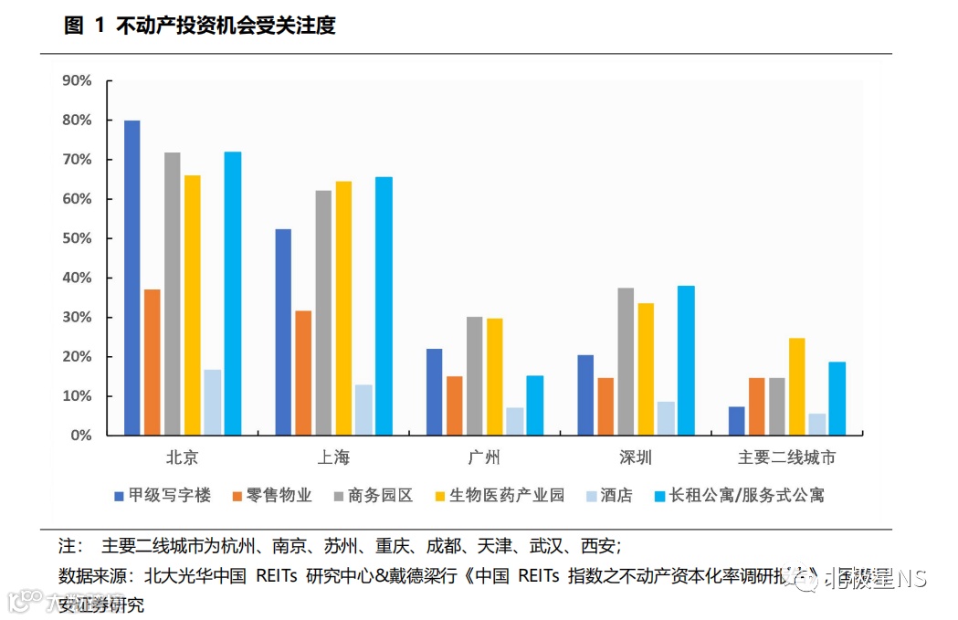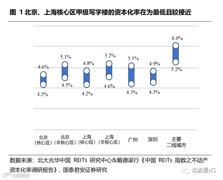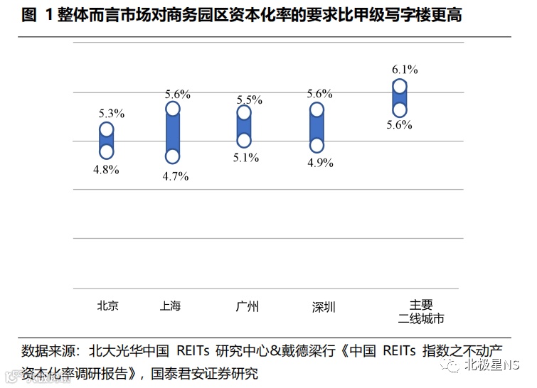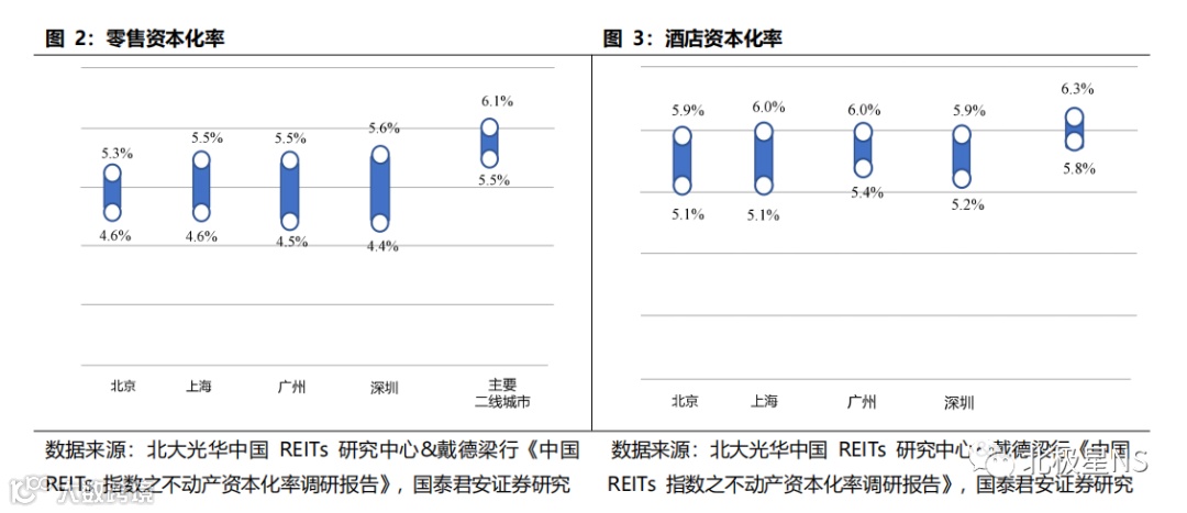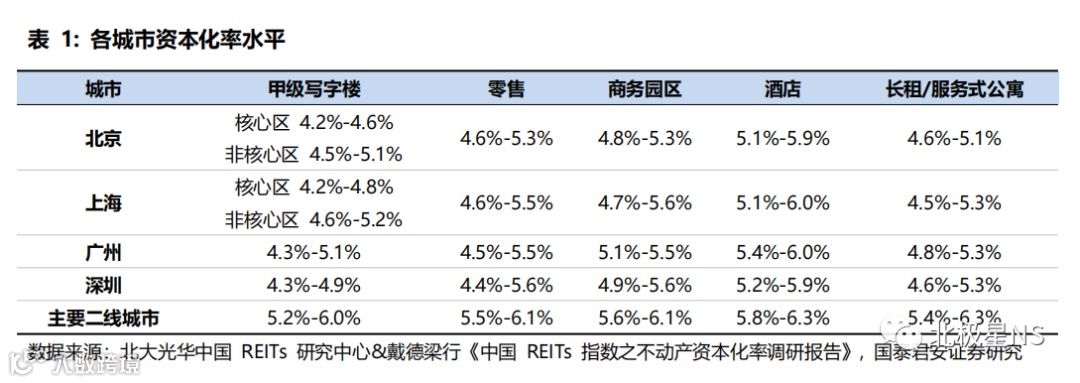 依据北大光华中国 REITs 研究中心联合戴德梁行《中国 REITs 指数之不动产资本化率调研报告》结果显示:①北京、上海核心区甲级写字楼的资本化率在所有城市及区域中为最低且较接近( 4.2%-4.8%),同城市中非核心区的项目资本化率高出约 30-50bps;②商务园区资本化率的要求比甲级写字楼更高,北京、上海、深圳三地的商务园区资本化率较为接近,约为 4.7%-5.6%;③对于一线城市的长租 / 服务式公寓资本化率,北京、上海、深圳处于同一梯队,在4.5%-5.3% 区间;④零售与酒店承压,资本化率有较大幅度的提升,在4.4%~6.3%区间。