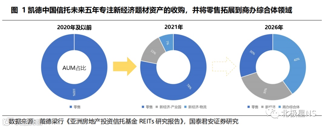 以凯德中国信托(CapitaLand China Trust—新加坡最大的专注投资中国资产的房地产投资信托基金)为例,未来五年,CLCT 将更专注新经济题材资产的收购,并将零售拓展到商办综合体领域:计划在五年内使商办综合体资产占比提升至40%,新经济资产占比从 22% 提升至 30%,而零售资产占比则从 2021 年的 78% 压缩至 30%。其背后逻辑是资产组合底层现金流来源更多元化,提升整体抗风险能力。