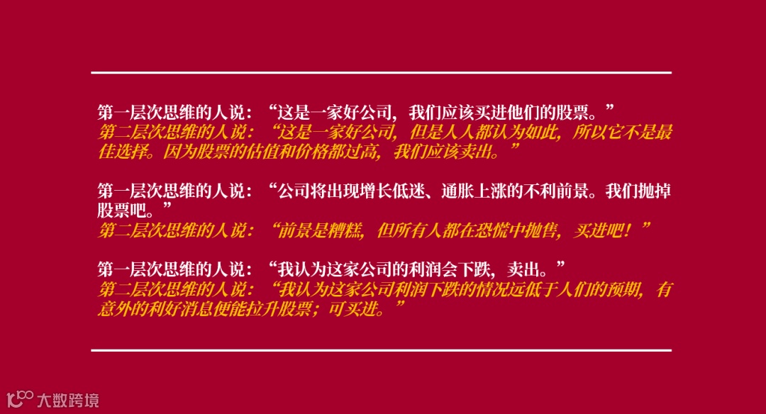 通过上面的例子不难发现,第一层次思维者看到的是表面,单纯地对表面现象作出反应;第二层思维者看到的是更深层次的、全面的情况,反复思考各种情况的可能性后作出决策。