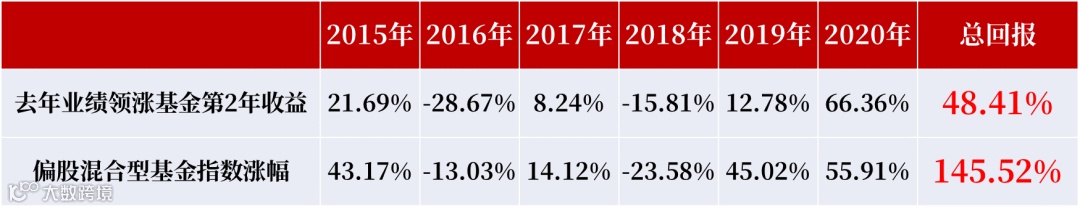 东方小红做一个统计,投资者每年1月1日选择去年的冠军基金(偏股混合型基金分类)投资,从2015年—2020年累计回报率为48.41%,而同期偏股混合型基金指数上涨145.52%。