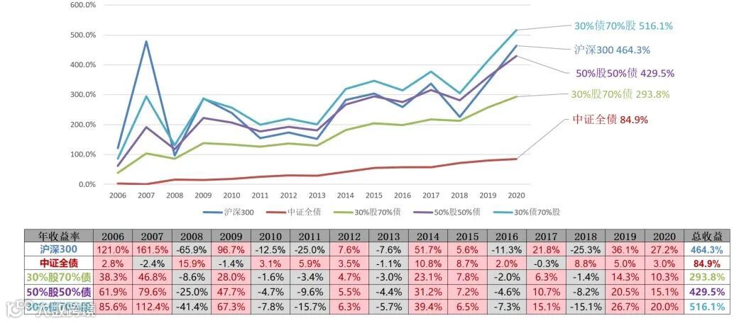 若再以股和债3∶7、5∶5、7∶3的比例来配置并对投资组合每年进行一次再平衡。不难发现:第一,走势图(下图)中紫色线条部分,股债5∶5的组合历经15年最终结果与满仓“沪深300”非常接近,但走势更为平滑,更利于投资者做到对组合的长期持有。第二,股债7∶3的组合15年后的总收益为516.1%,高于满仓任意单一品种的各自收益。第三,股债3:7的组合走势稳健,波动较小,且能够实现293.8%的总收益。