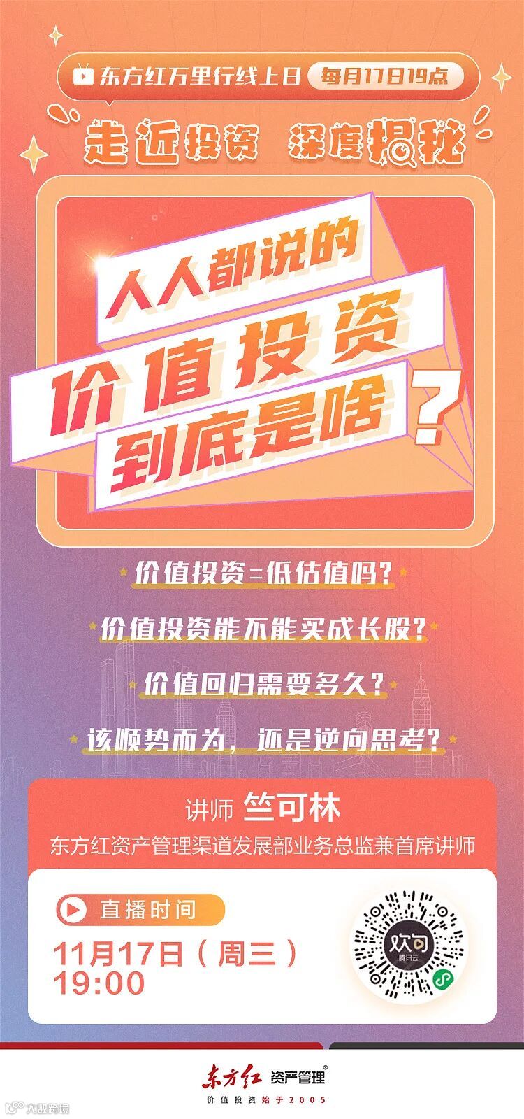 11月17日19点(周三晚),锁定东方红直播间,东方红资产管理渠道发展部业务总监兼首席讲师竺可林与您一起聊聊大家关心的有关价值投资的小话题。