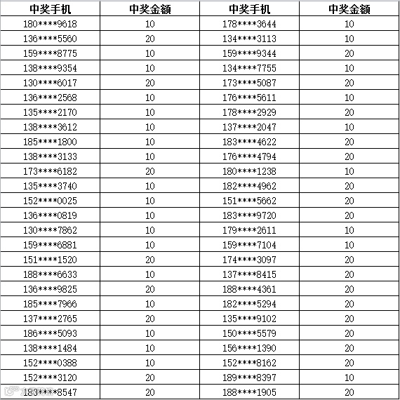 3、中奖金额将于每周五以话费的形式发放到您的中奖手机,届时敬请留意短信
