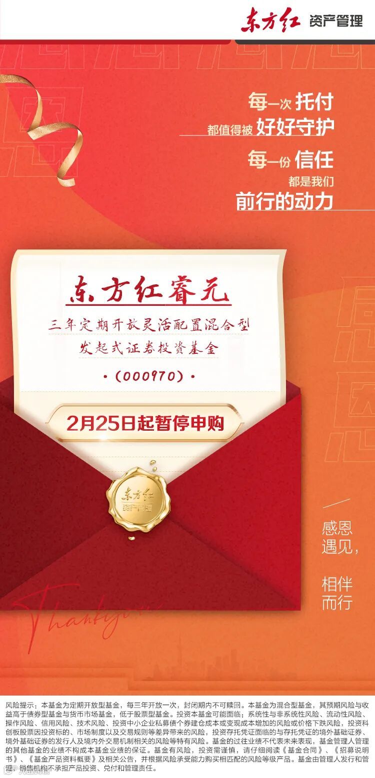 东方红睿元三年定期开放灵活配置混合型发起式证券投资基金本次开放期为2021年2月24日(含)至3月23日(含)期间的20个工作日,本基金将自2021年2月25日(含)起暂停办理申购业务,赎回与转换转出业务的办理不受影响。