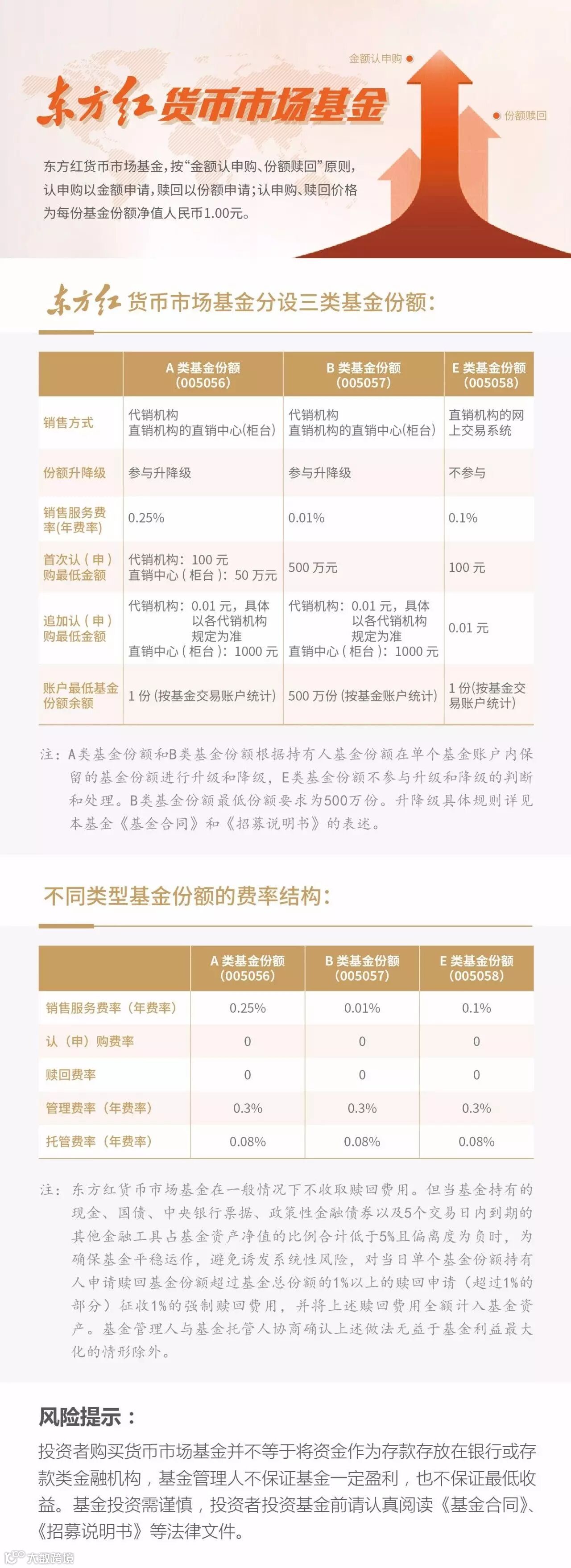 风险收益特征:本基金为货币市场基金,属于证券投资基金中的低风险品种,其预期收益和风险均低于债券型基金、混合型基金及股票型基金。