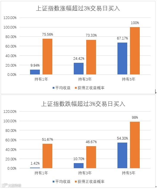 我们仅以2010年以来在上证指数单日涨/跌幅超过3%的交易日买入偏股混合型基金指数为例进行测算,投资者持有1年、3年、5年的都获得了平均正回报,且随着投资时间推长,获得的正收益概率越来越高。事实上,无论是何时买入,持有时间足够长,都能极大概率获得不错的回报。说明相比短期择时频繁交易,长期投资基金能够较好的回报。