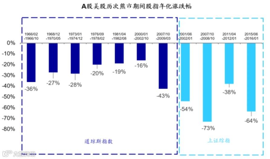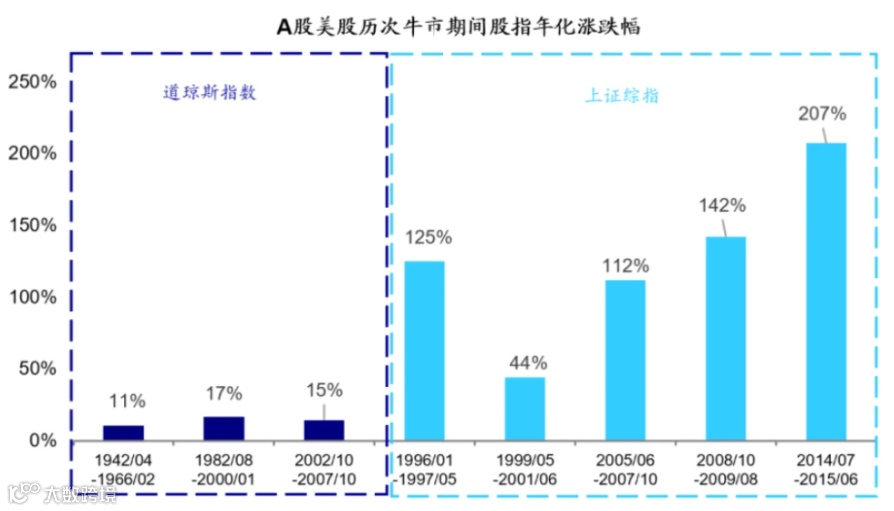从时间上看,A股一轮牛熊周期为5-6年,而美股一轮牛熊周期近20年,A股的周期轮回节奏更快。A股指数在牛熊市中的涨跌幅均很大,1991年以来五轮完整的牛熊周期中上证综指在牛市区间的涨跌幅分别是1459%、195%/114%(第二轮周期中有两段牛市)、514%、109%和180%,换成复合年化涨幅为255%、125%/44%、112%、142%和207%,剔除第一次极端值后平均为126%,熊市区间的年化涨跌幅分别为-61%、-54%、-73%,-38%和-64%,平均为-58%。而对比美股,道指在牛市中的平均年化涨幅为20%,熊市平均年化跌幅为-29%。