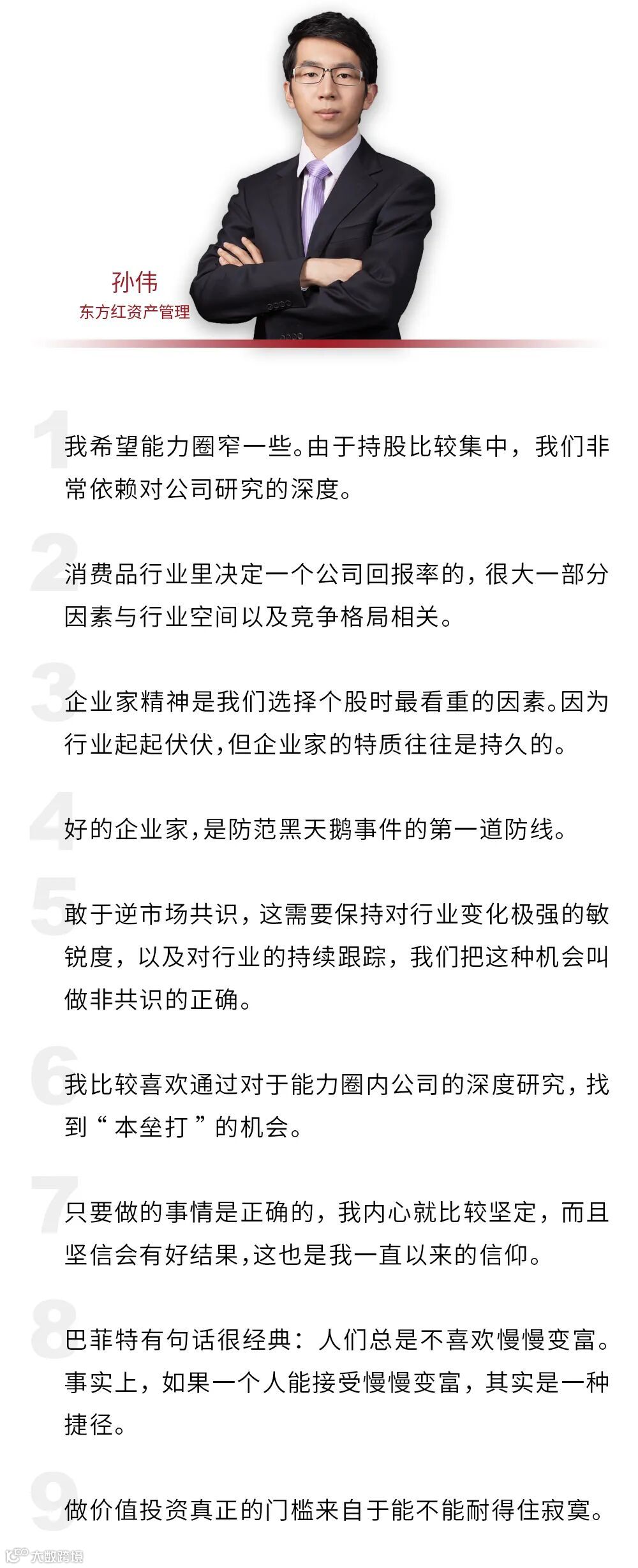 孙伟 我们公司坚持传统的价值投资,采用自下而上的选股方式,倡导每个人要在自己的能力圈内做事。但与大部分人希望扩大能力圈不同,我希望能力圈窄一些。由于我们是在行业分散前提下的持股集中,非常依赖对公司研究的深度。我是看消费品出身的基金经理,在做投资管理之前研究了五六年食品饮料和农业。这一点对我做投资影响比较大。