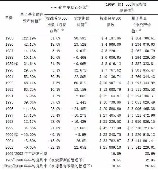 ②量子基金(2000年5月之后为量子捐助基金)扣除所有费用后的净资产价值。假设股息全部用于再投资。