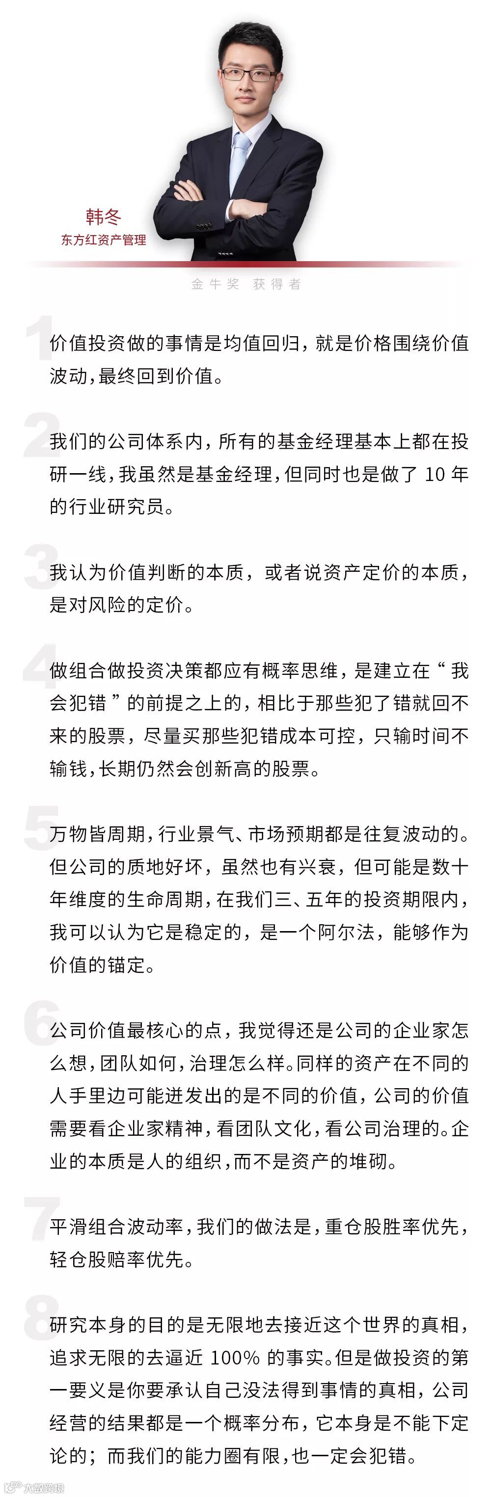 东方红资产管理公募权益投资部基金经理韩冬,管理的东方红中国优势混合连续两年获得“金牛奖”,但韩冬始终以淡定的态度看待投资结果。他看待世界是以概率的视角,认为并不存在百分百正确的解题方法和答案。人总会犯错,但找到一个真正的好公司可以降低结果出错的概率和损失。