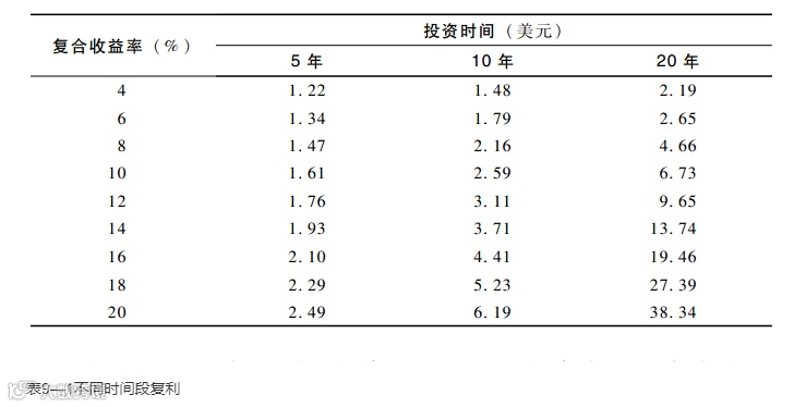 投资1美元,按不同的复利率来计算,在不同时期得到的结果。这张表值得深究,体现出了时间的巨大力量。在投资方面,时间就是阿基米德的杠杆!