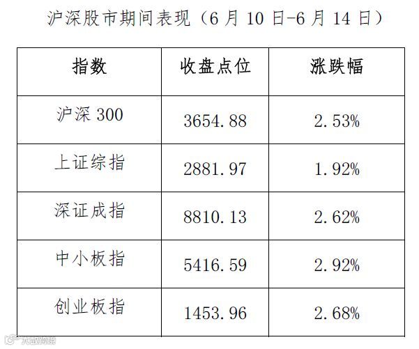 上周(6月10日-6月14日)A股整体上涨。上证综指收于2881.97点,周涨幅2.53%;深证成指收于8810.13点,周涨幅2.62%;中小板指收于5416.59点,周涨幅2.92%;创业板指收于1453.96点,周涨幅2.68%。