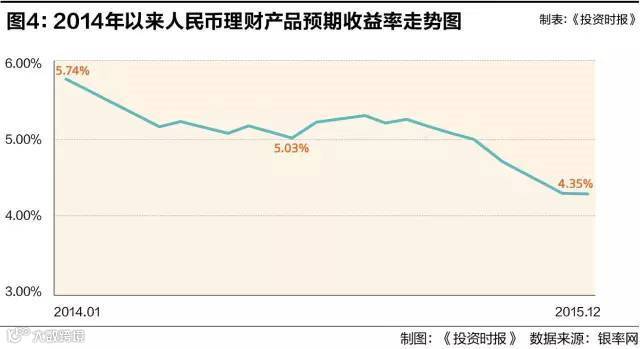 2014年以来,银行理财产品的收益率走出了明显的下行趋势,2015年12月,人民币非结构性理财产品的平均预期收益率已下降至4.35%。Wind资讯统计,在2015年发行的银行理财产品中,收益率超过5%的产品同比下降了17.16%,占比也较2014年下降了近20个百分点。