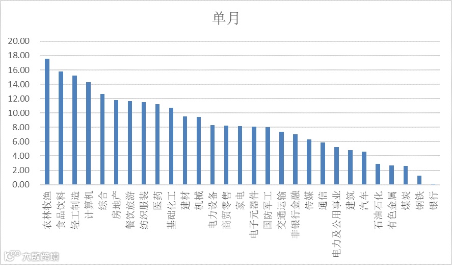 当月行业普涨中带有分化,银行、周期表现较弱,农业和食品饮料领涨。