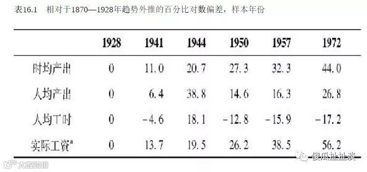 美国历史上两个沉重的话题是1930年代大萧条和1940年代二战,一次经济崩溃一次血泪回忆。戈登却新颖地提出一个观点:大萧条和二战促成了经济增长的大跨越。如果没有大萧条,就没有新政,就没有《国家产业复兴法案》和《瓦格纳法案》,也就无法推动工会的发展,无法带来工资增长和工时下降。更高的工资和更短的工时促进了资本对劳动力的替代,固定资产投资增速明显上升。30年代设备投资显著反弹,设备投资和设备资本价值比率在1928年为13.6%,到了1941年上升到17.1%。