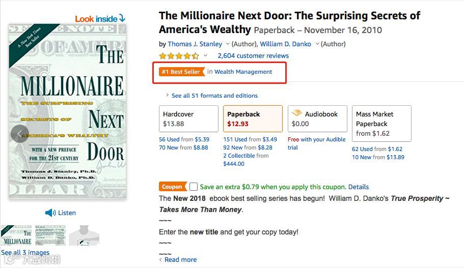 初出版于1996年,再出版于2010年,托马斯·J·斯坦利和威廉·D·丹科撰写的《邻家的百万富翁:美国富翁的惊人秘密》在2018年依然是美国亚马逊上销售量排行第一的财富管理书籍,也是美国人们的必备财富指南。该书通过作者对美国百万富翁的十几年调查,研究众多个人案例以总结出来的守财之法与生财之道,给予后人金钱观与消费观的启示。正如书中说道:“大部分的百万富翁不住在比弗利山庄,而是住在我们的身边”,每一个人都有可能成为百万富翁。