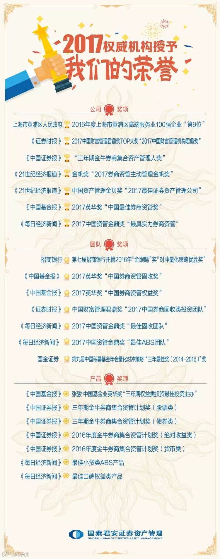 “新金融·新发展”2018年金融发展高峰论坛暨2017年度TOP金融榜评选,是澎湃新闻对金融领域第一次展开全面、深刻的评奖事件。国君资管此次荣获“年度券商资管”奖,是业界对我们的又一次肯定。2017我们受到了权威机构的高度认可,包揽外部权威机构所有重要奖项。