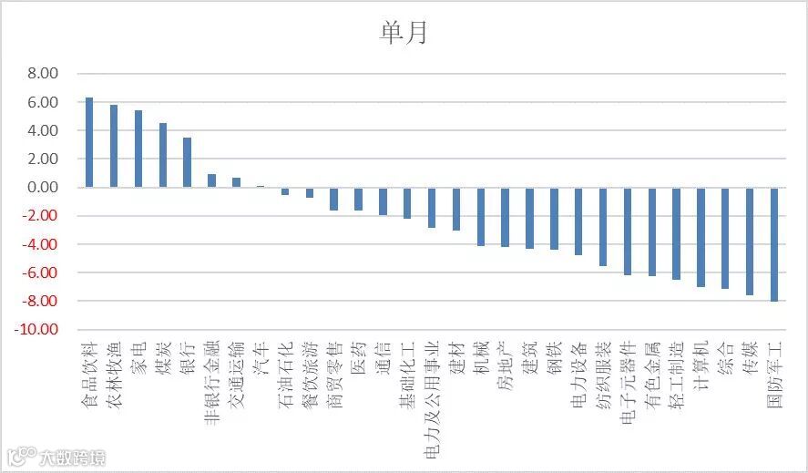 当月行业明显分化, 食品饮料、农林牧渔、家电等行业领涨,TMT、军工等行业下跌明显。
