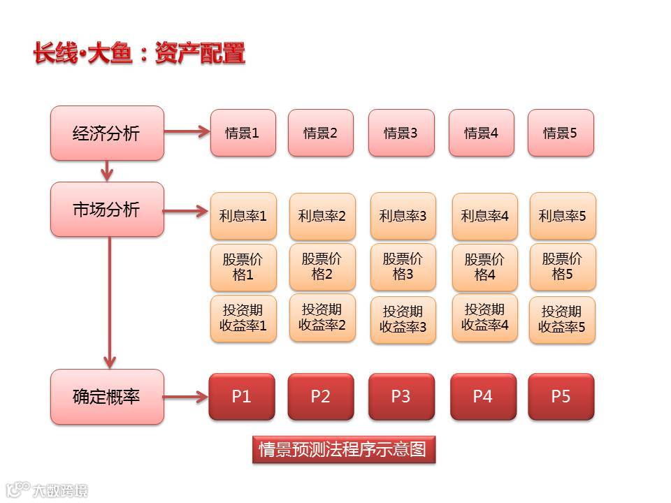 第一步是确认经济环境可能存在的范围。图中列示了5个可能情景,主要是通过多种经济分析手段确认在每个情景中可能出现的预期实际增长和通货膨胀率情况。同时需要注意的是具体情景的数量因经济状况的改变以及各投资者的偏好会有所不同;