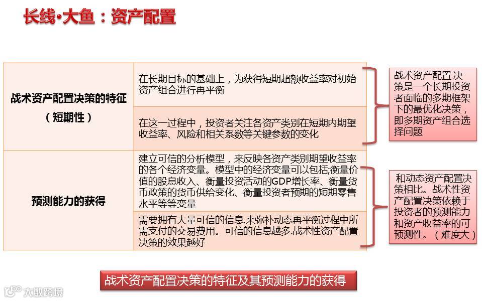 以长期目标为出发点,投资者可以通过对资产的短期收益变化趋势的预测进行适时再平衡,即战术资产配置决策;