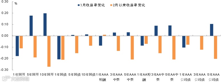 ➤较1月来看,2月以来主要券种收益率下行幅度更为显著。